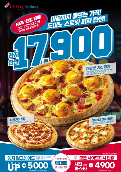No.1 세계 배달 피자 리더 도미노피자가 인플레이션으로 어려움을 겪고 있는 고객들을 위해 L 사이즈 한 판당 17,900원인 스트릿 피자 3종을 내일 출시한다.