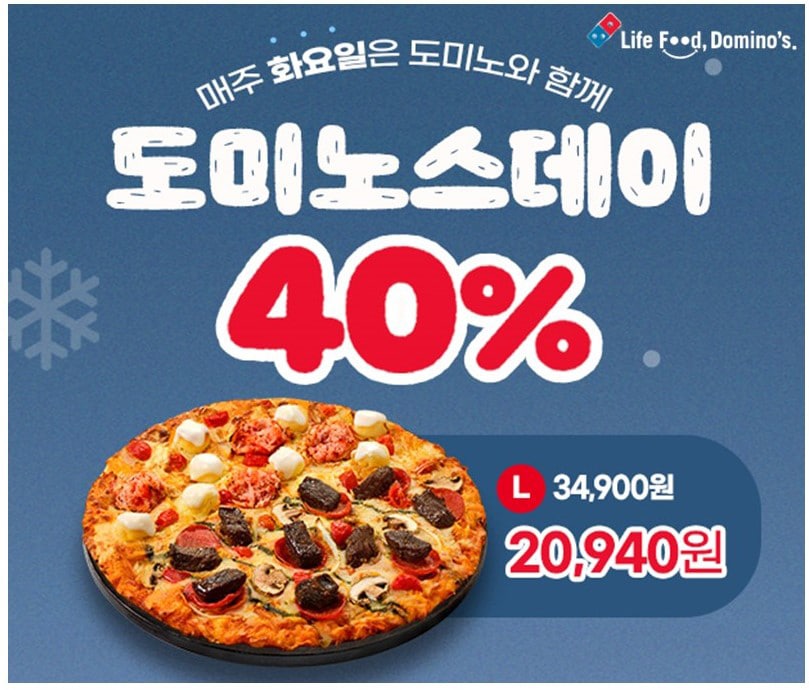 이번 프로모션은 도미노피자 신규 가입 및 휴면 해제 회원을 포함한 온라인 회원(홈페이지, 모바일, 웹, 어플)을 대상으로 진행된다. 온라인 포장 주문 시 모든 피자(M,L)를 40% 할인된 가격에 제공하며, 1회 2판까지 혜택을 적용 받을 수 있다. 제휴 및 쿠폰 등 여타 할인과 중복 할인은 불가하고, 사이드디시 반값과 중복 사용은 가능하다. (자세한 사항은 도미노피자 홈페이지 참조)