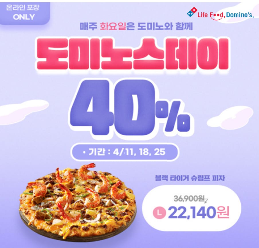 이번 프로모션은 도미노피자 온라인 회원을 대상으로 진행되며 매주 화요일(11일, 18일, 25일)에 온라인 포장 주문 시 40% 할인 혜택을 제공한다. 할인은 1회 2판까지 적용할 수 있으며 여타 할인과는 중복이 불가하다. (자세한 사항은 도미노피자 홈페이지 참조)