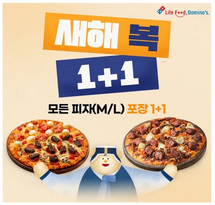 No.1 세계 배달 피자 리더 도미노피자가 새해를 맞아 피자 한 판을 주문하면 한 판 더 제공하는 ‘새해 복 1+1’ 프로모션을 진행한다.