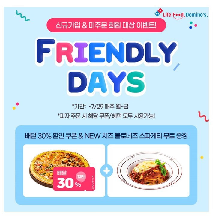 프랜들리 데이즈는 신규회원 및 미주문 회원을 대상으로 이번 달 29일(금)까지 매주 평일에 진행되며 피자배달 30% 할인과 도미노피자의 인기 사이드디시 ‘NEW 치즈 볼로네즈 스파게티’ 1개를 무료 제공한다. 배달 30% 할인 쿠폰은 매주 월요일부터 7일간 사용 가능하다.