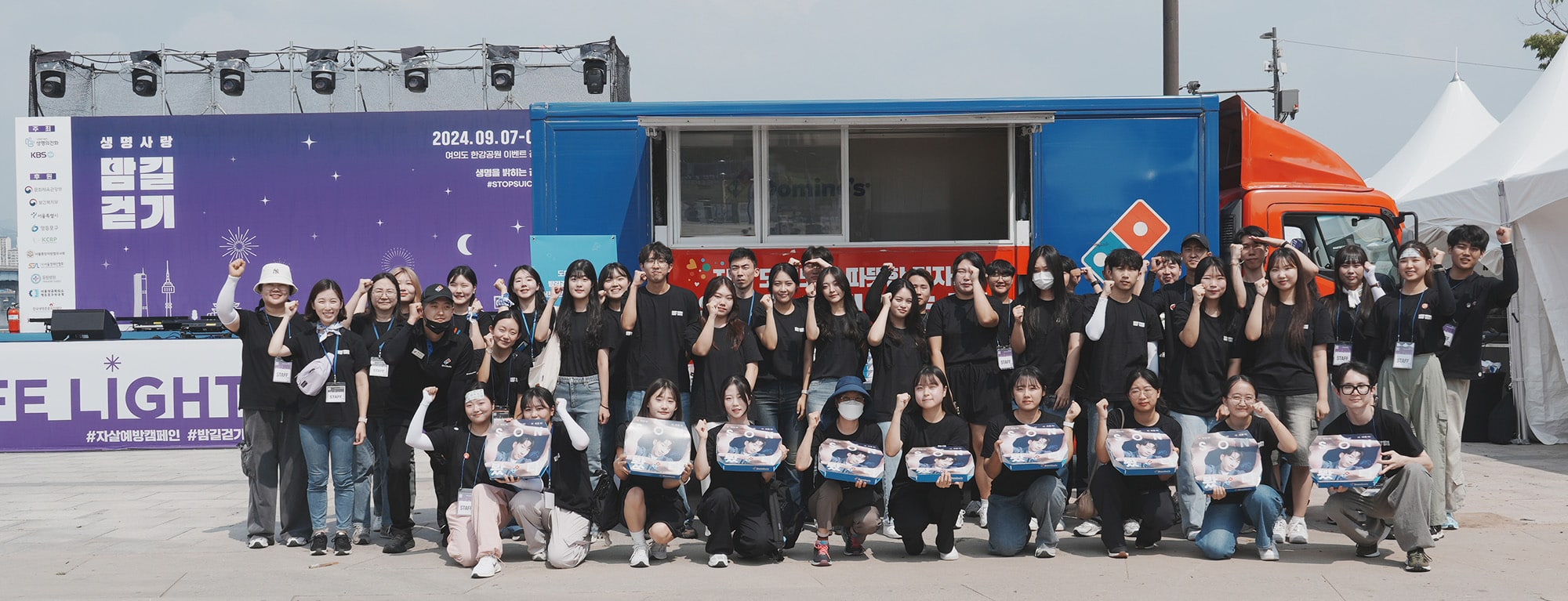 도미노피자는 지난 7일(토) 서울 여의도 한강공원 이벤트광장에서 세계 자살예방의 날을 앞두고 개최된 자살예방 캠페인인 ‘생명사랑 밤길걷기’에 파티카로 동참했다. 도미노피자의 ‘생명사랑 밤길걷기’ 캠페인 참가는 작년에 이어 두 번째로, 생명의 소중함을 알리고자 모인 러버커들을 위해 현장에서 따뜻한 피자를 만들어 전달했다.