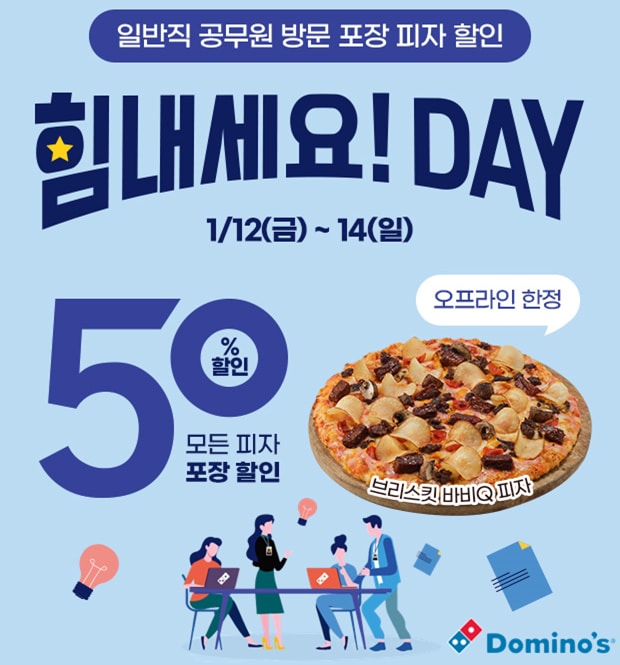 도미노피자의 ‘힘내세요! DAY’는 일반직 공무원 55만 명을 위한 프로모션으로 12일(금)부터 14일(일)까지 오프라인 매장 방문 포장 시 모든 피자 반값 할인 혜택을 제공한다. 프로모션은 1회 2판까지 할인 적용 가능하며, 오프라인 매장에서 공무원증 혹은 재직증명서를 통한 신분 확인 후 이용할 수 있다. (자세한 내용은 도미노피자 홈페이지 참조 / 국가직, 지방직 공무원도 적용 가능)