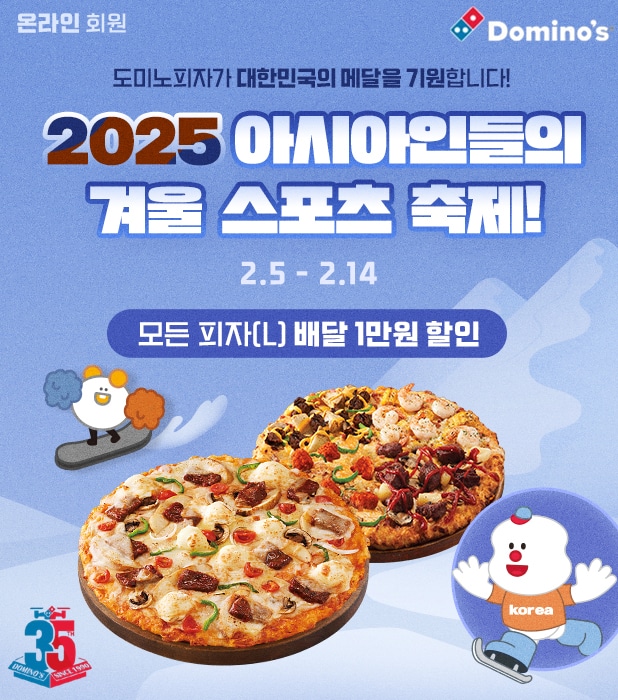도미노피자의 ‘2025 아시아인들의 겨울 스포츠 축제’ 프로모션은 오늘(5일)부터 14일(금)까지 대한민국 국가대표선수들의 선전을 회원들과 같이 응원하기 위해 기획한 것으로 모든 피자(L) 배달 주문 시 1만원 할인 혜택을 제공한다.