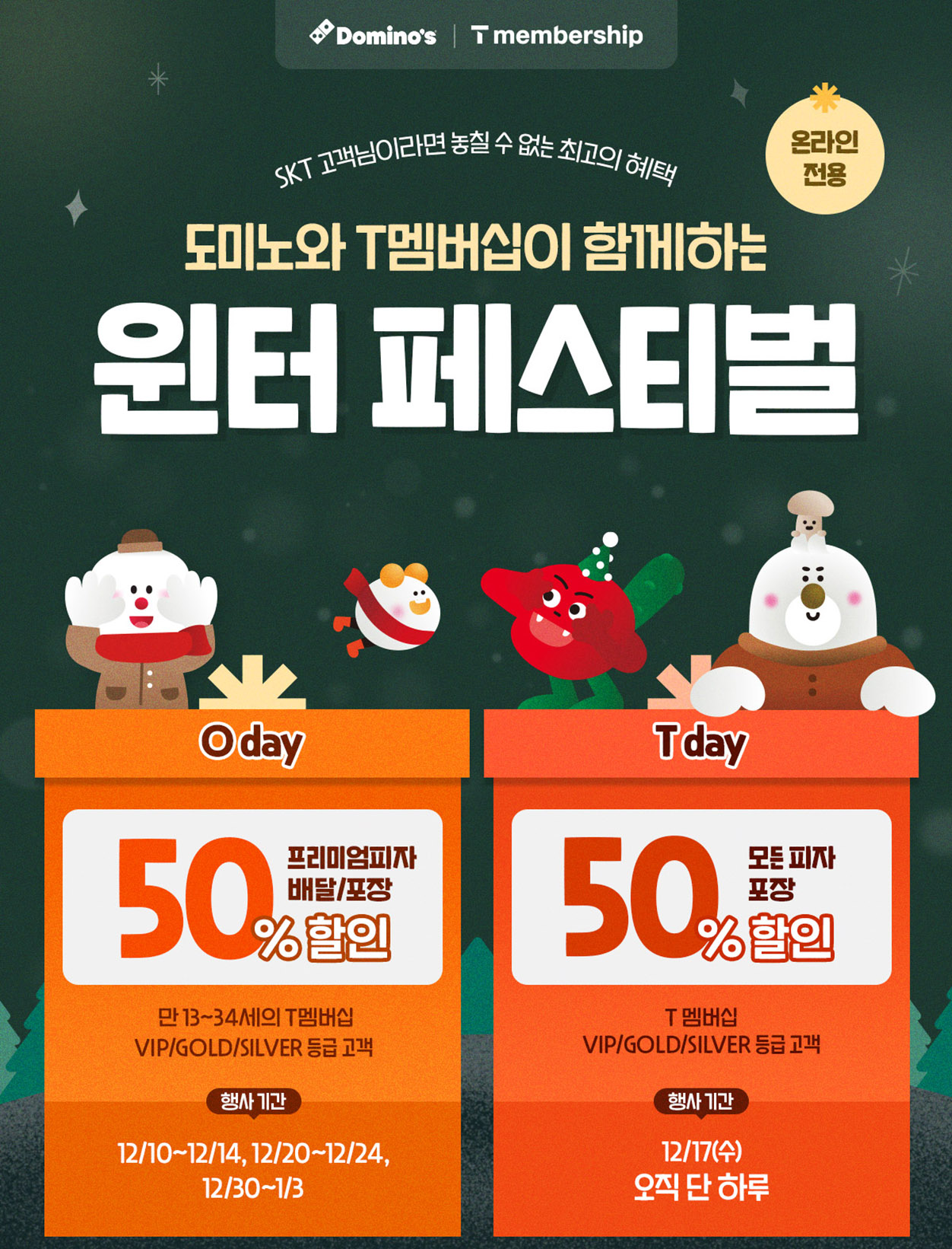 이번 도미노피자와 SKT가 진행하는 ‘윈터 페스티벌’은 도미노피자를 온라인 주문한 T멤버십 고객을 대상으로 진행된다. 이번 윈터 페스티벌은 프리미엄 피자 포장, 배달 주문 시 모두 사용 가능한 50% 할인 쿠폰을 제공하는 ‘0 day’와, 17일(수) 하루 동안 방문 포장 시 모든 피자 50% 할인 또는 적립 혜택을 받을 수 있는 ‘T day’로 구성됐다.
