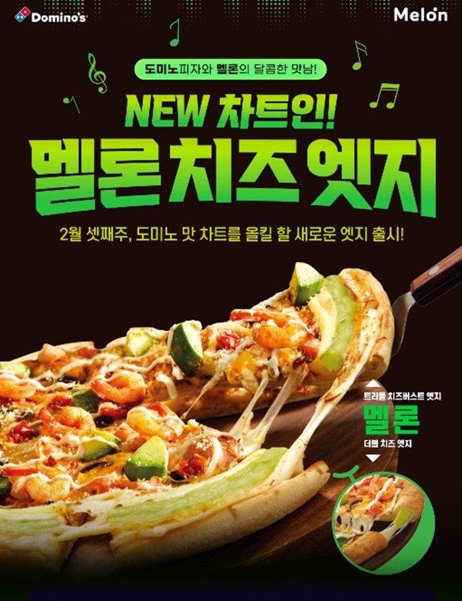 No.1 세계 배달 피자 리더 도미노피자가 발렌타인데이를 맞아 No.1 뮤직플랫폼 멜론과 협업해 ‘멜론 치즈 엣지 2종’을 오는 28일(화)까지 한정 판매한다.
