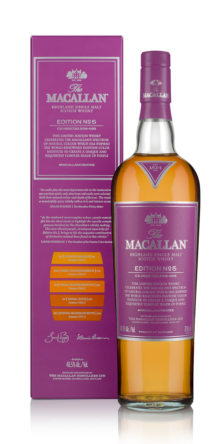 이번에 국내에 선보이는 맥캘란 에디션 넘버5는 세계적인 컬러 연구소인 팬톤 컬러 연구소와 맥캘란이 협업해 출시한 제품으로 전국 주요 주류 매장과 호텔 몰트바에서 판매된다. (소비자 가격 : 230,000, 용량 : 700mL. 도수 : 48.5%)