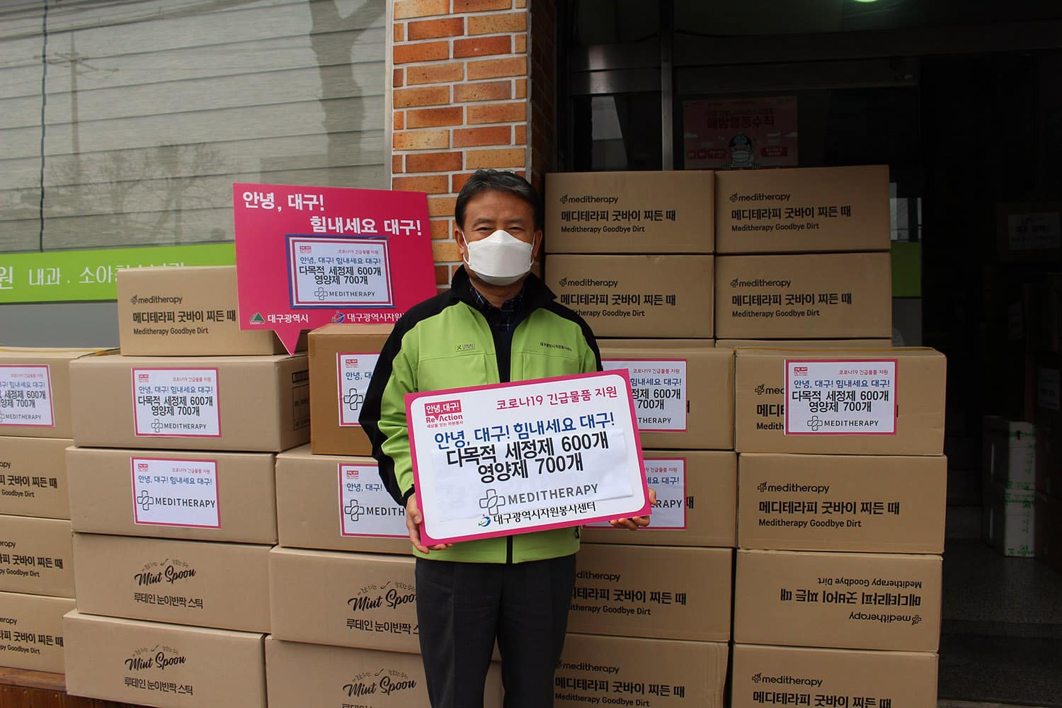 미디어커머스 전문기업 메디테라피(대표 이승진, 이한승)가 코로나19로 고생하는 대구광역시 자원봉사센터에 다목적 세정제와 영양제 등 3천만원 상당의 자사 제품을 전달했다고 30일 밝혔다.