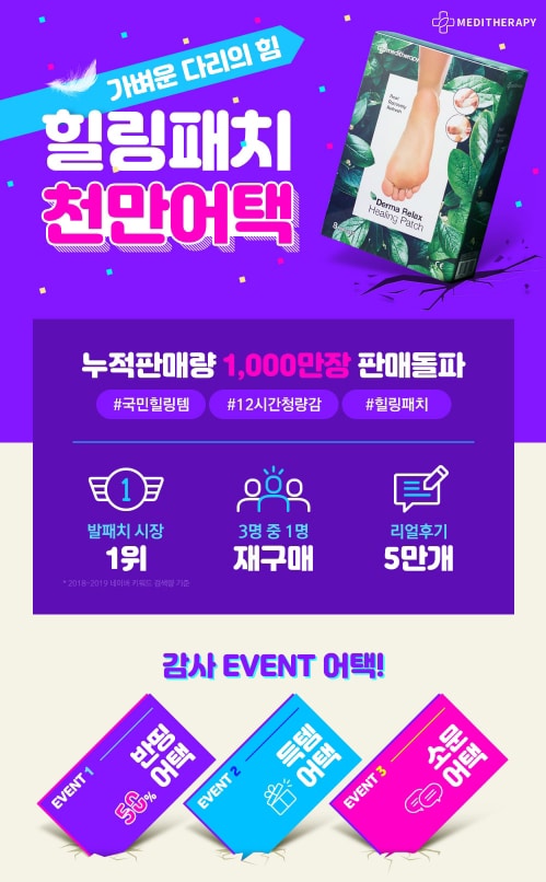 먼저 힐링패치를 저렴하게 구매할 수 있는 ‘반띵어택’ 이벤트가 진행된다. 오는 6일까지 힐링패치 1세트를 ‘반띵’ 할인된 가격인 14,950원에 구매 가능하다. , 힐링패치 3세트 구매 시 1세트 추가 증정, 6세트 구매 시 2세트와 지압봉 무료 제공 등 풍성한 혜택과 함께 힐링패치를 최대 59% 할인된 가격에 만나볼 수 있다. 뿐만 아니라 메디테라피의 베스트 아이템들도 최대 59% 할인된 가격에 판매된다.