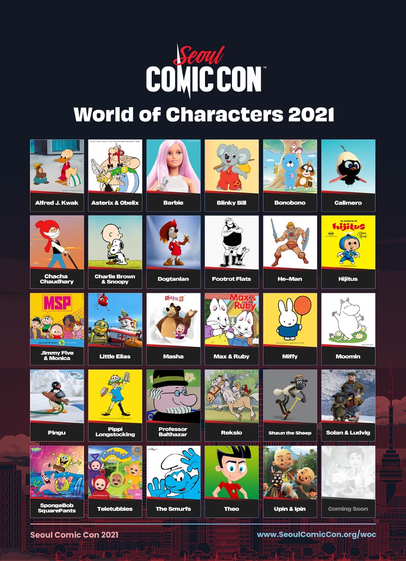 이외에도 ▲바비(Barbie) ▲히맨(He-Man) ▲달타냥(Dogtanian) ▲맥스 & 루비(Max & Ruby) ▲레크시오(Reksio) ▲마샤(Masha) ▲지미 파이브 & 모니카(Jimmy Five & Monica) ▲아스테릭스 & 오벨릭스(Asterix & Obelix) ▲엘리아스(Elias) ▲우핀 & 이핀(Upin & Ipin) ▲솔란 & 루드빅(Solan & Ludwig) ▲칼리메로(Calimero) ▲테오(Theo) ▲풋롯 플랫즈(Footrot Flats) ▲꽉꽉(Alfred J. Kwak) ▲블링키 빌(Blinky Bill) ▲히지 투스(Hijitus) ▲못말리는 어린양 숀(Shaun the Sheep) 이 등장한다. ‘월드 오브 캐릭터’에 관한 자세한 내용 및 라인업은 서울 코믹콘 공식 홈페이지를 통해 확인할 수 있다.