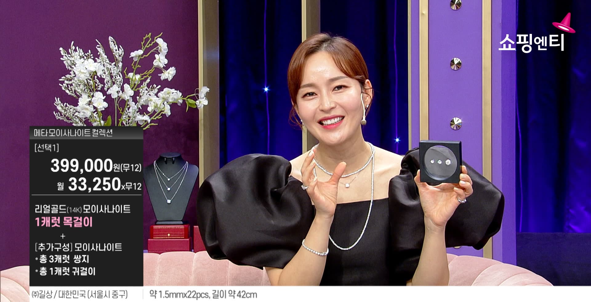 방송 중에 상품을 구입하는 소비자에게는 모이사나이트 3캐럿 쌍지와 1캐럿 귀걸이 총 4캐럿 추가 구성 혜택을 제공한다. 이 외에도 최대 36개월 무이자 혜택과 모바일 앱으로 결제 시 적립금 최대 4만원을 받을 수 있다.