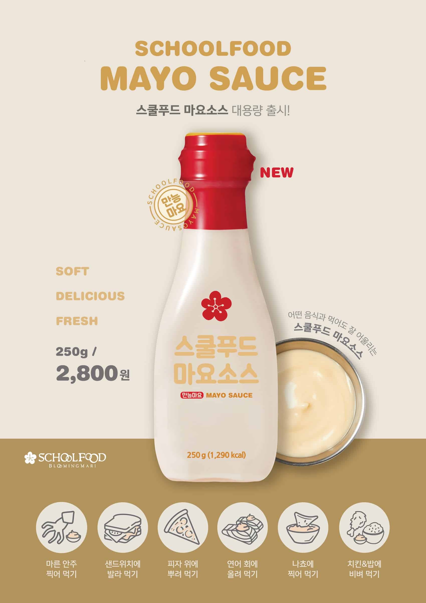 ‘스쿨푸드 마요소스’는 스쿨푸드 대표 인기 메뉴인 ‘마리’를 찍어 먹는 달콤하고 고소한 특제 소스다. 평소에 스쿨푸드 음식을 선호하는 ‘팬슈머(Fansumer, Fan+Consumer)’로부터 큰 사랑을 받아 출시 요청이 끊임없이 이어졌다.