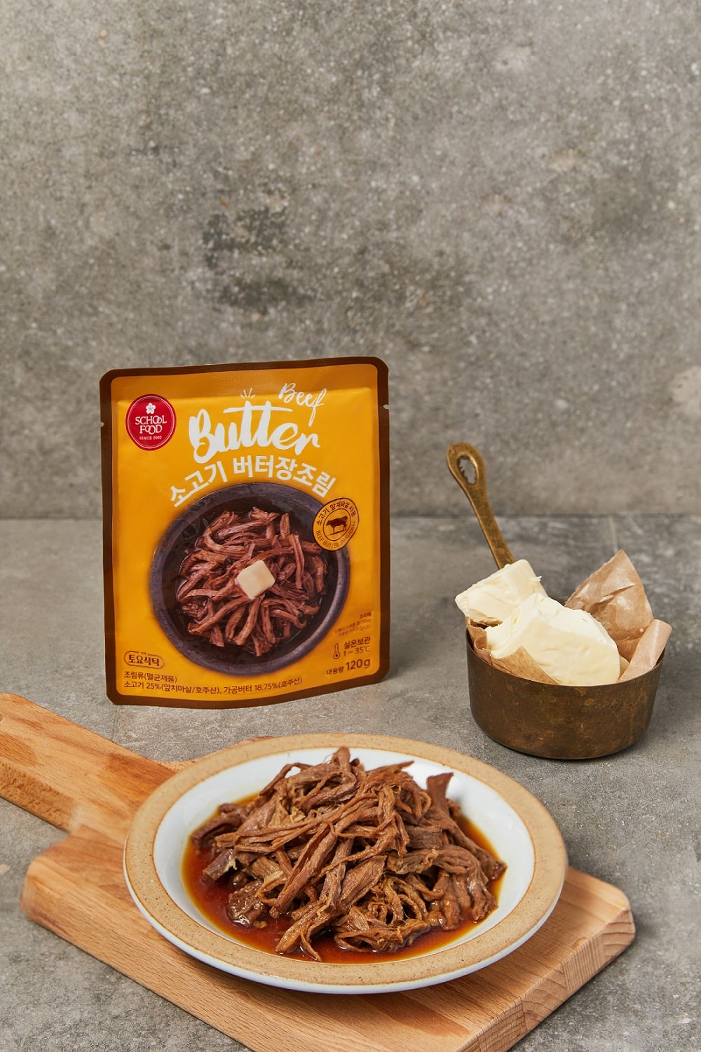 ‘소고기버터장조림’은 매년 50만 개 이상 판매되는 스쿨푸드의 인기 메뉴 ‘장조림버터비빔밥’의 핵심 재료. 마니아 층 고객에게 큰 인기를 끌며 가정간편식 출시 요청이 이어지자 이를 반영해 출시한 제품이다. 소고기의 고급 부위에 해당하는 앞치마살과 버터와 간장에 졸여 풍부한 육즙과 짭쪼름하면서 고소한 맛을 느낄 수 있는 것이 특징.