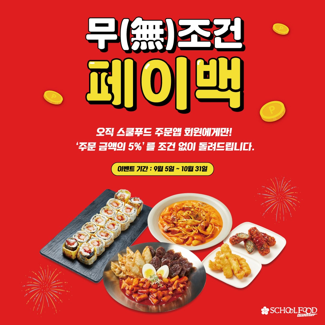 프리미엄 분식 프랜차이즈 스쿨푸드(대표 이양열)가 가을을 맞아 자사 앱에서 ‘스쿨푸드 무(無)조건 페이백!’ 이벤트를 진행한다.