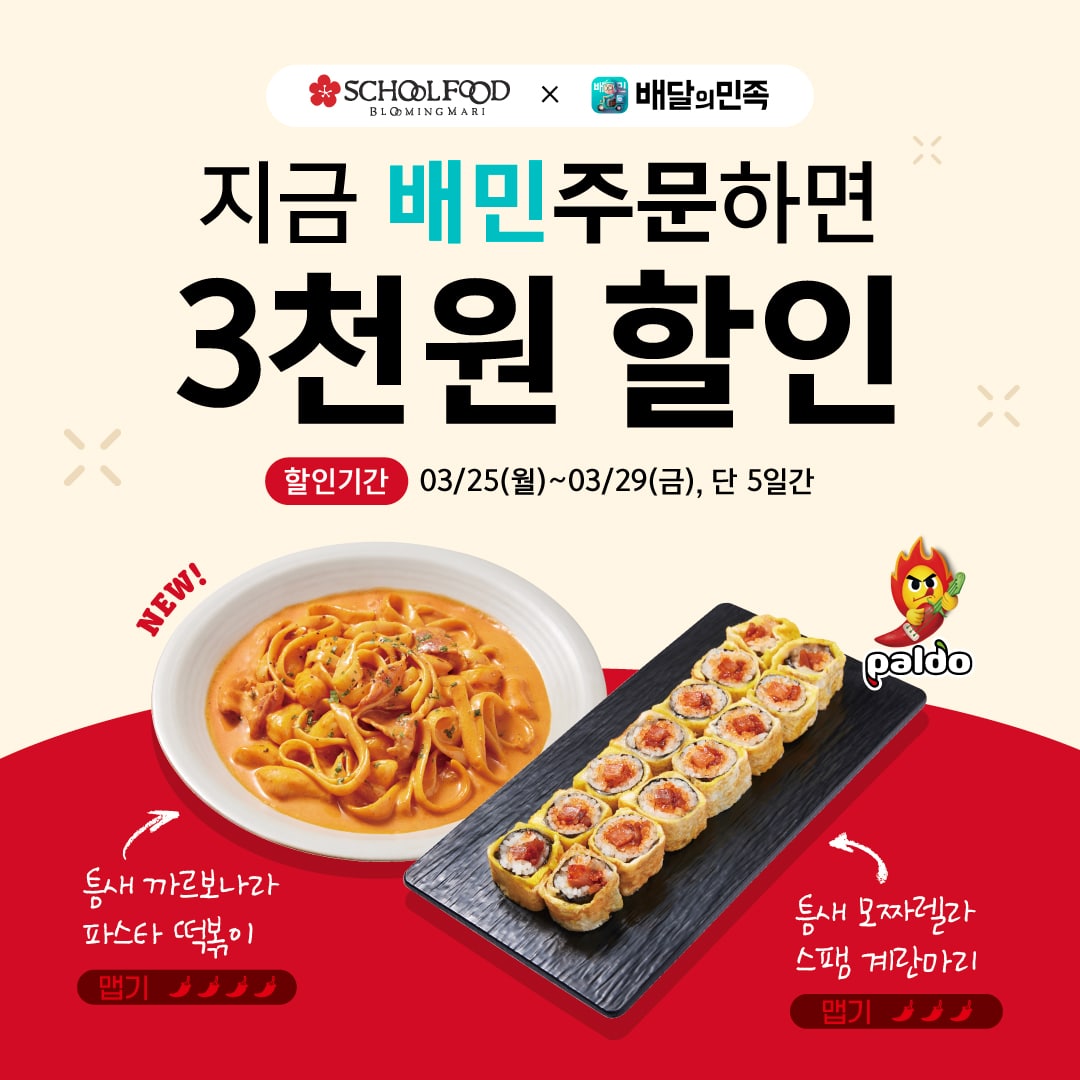 이번 배달의민족 할인 프로모션은 스쿨푸드와 팔도 틈새라면의 매운맛을 그대로 구현한 틈새소스가 협업해 톡 쏘는 매콤함을 더한 △틈새 모짜렐라 스팸 계란 마리와 △틈새 까르보나라 파스타 떡볶이를 포함해 스쿨푸드의 전 메뉴를 최소 주문금액 18,000원 이상을 구매하면 3,000원 할인 혜택을 받을 수 있다.