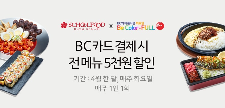이번 프로모션은 카카오톡 주문하기를 통해 스쿨푸드를 주문하는 고객 중 BC카드로 결제하는 고객을 대상으로 진행된다. 대상자에게는 계정 당 1일 1회에 한해 스쿨푸드 전 메뉴에 적용 가능한 5,000원 할인 쿠폰이 제공된다.
