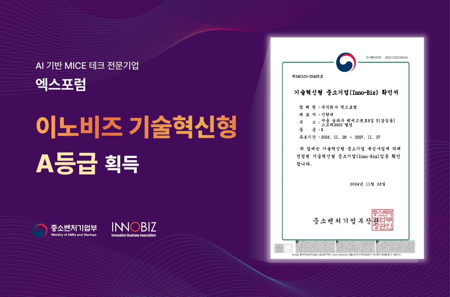 MICE(기업회의·포상관광·컨벤션·전시회) 산업의 대표 주최사인 엑스포럼(대표이사 신현대)이 중소벤처기업부에서 주관하는 기술혁신형 중소기업 인증인 ‘기술혁신형 중소기업 이노비즈(Inno-Biz)’ 인증을 획득했다고 11일 밝혔다.