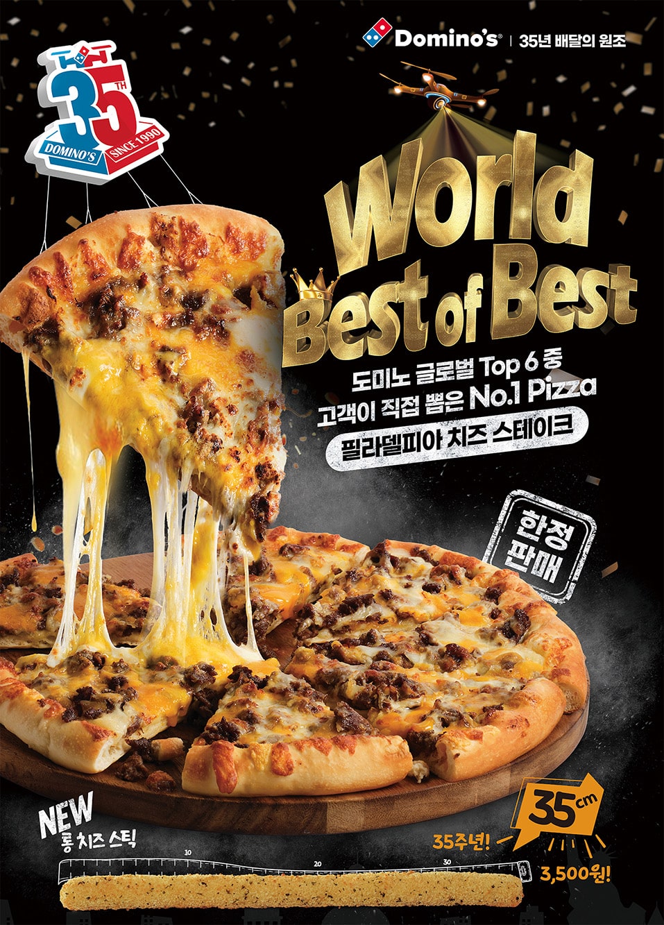 이와 함께 도미노피자는 이번 신메뉴 출시와 함께 35주년을 기념해 35cm의 쫄깃하고 고소한 치즈를 가득 채운 ‘35cm 롱 치즈 스틱’도 출시해 필라델피아 치즈 스테이크 피자와 동시에 즐길 수 있게 했다. 이번 ‘35cm 롱 치즈 스틱’은 3,500원에 즐길 수 있다.