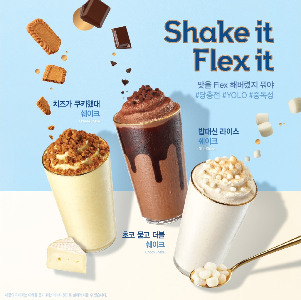 이번에 선보인 신제품은 ▲초코 묻고 더블 쉐이크 ▲밥대신 라이스 쉐이크 ▲치즈가 쿠키했대 쉐이크 3종으로 최근 젊은 층에서 확산 중인 자신의 라이프 스타일을 뽐내는 ‘플렉스(Flex)’ 문화를 모티브로 ‘맛을 Flex 한다’는 콘셉트를 적용했다. 쉐이크에 초콜릿 칩, 찰떡, 쿠키 등 다채로운 토핑을 올려 SNS 컨텐츠에 어울릴 시각적인 매력을 더했으며 부드러운 우유의 맛과 부담 없는 단맛을 지닌 쉐이크 베이스를 사용해 달콤함과 고소함을 극대화했다.
