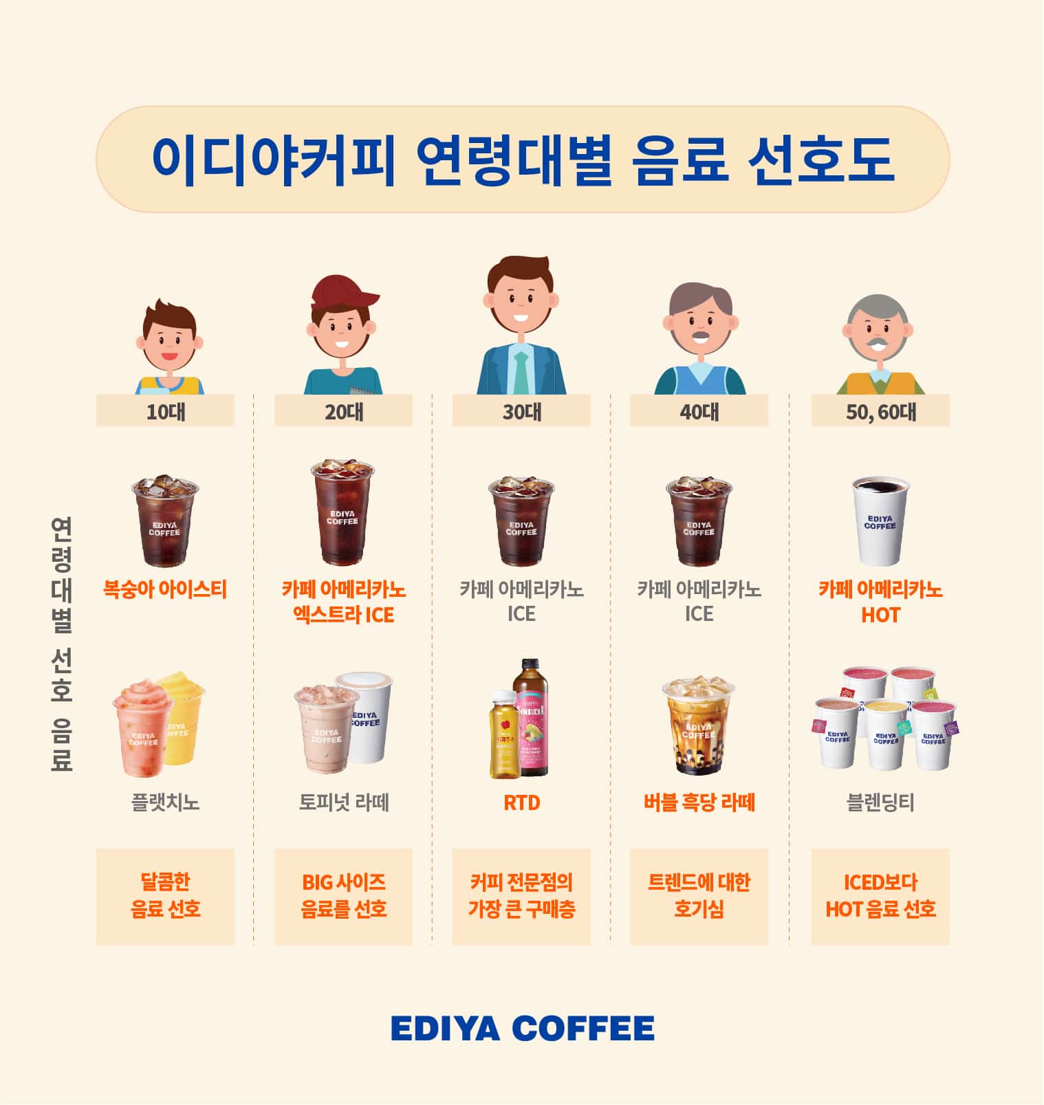 2019년 현대경제연구원 발표에 따르면 한국의 커피 산업은 세계 6위 수준으로 작년에 시장규모 약 7조원을 넘겼으며 성인 1명이 1년 동안 약 353 잔의 커피를 마신다. 이디야커피는 우리나라에 서 최다 매장을 보유한 커피 브랜드로 연간 약 1억 7천만잔의 음료를 판매하고 있으며, 이중 커피 음료 판매는 연간 약 1억잔에 달한다. 이디야커피는 이번 조사를 통해 2019년 한 해 동안의 연령대별 구매 내역을 바탕으로 음료 트렌드를 분석했다.