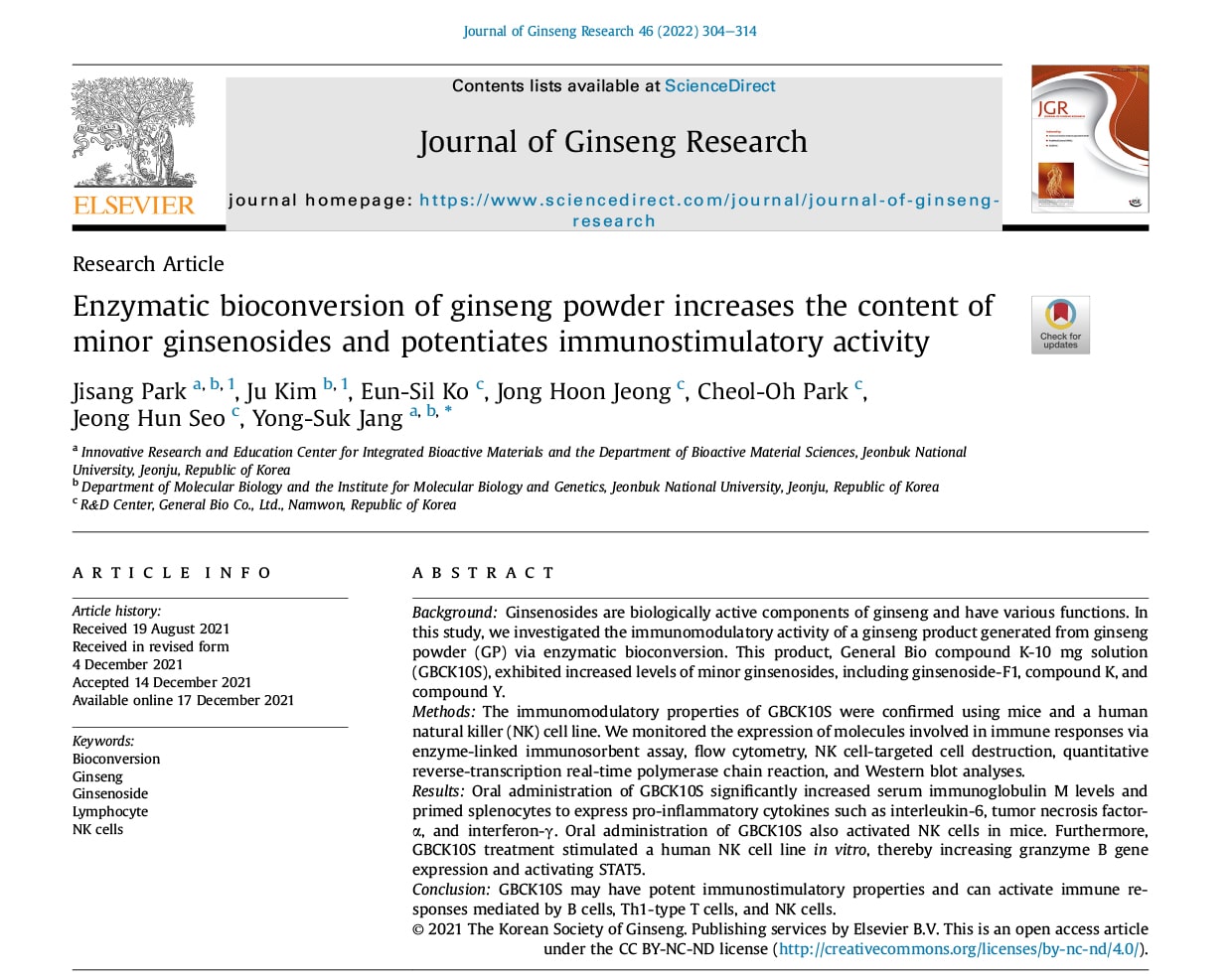 고려인삼학회지는 세계 유일의 인삼분야 학술지로 SCIE에 등재되는 등 국제적으로 공인된 저널이다. 제너럴바이오와 전북대학교 연구진은 2년여 간의 공동 연구 끝에 SCI급 저널에 인삼발효추출물의 면역 증진 기능성에 관한 연구 성과를 등재했다.
