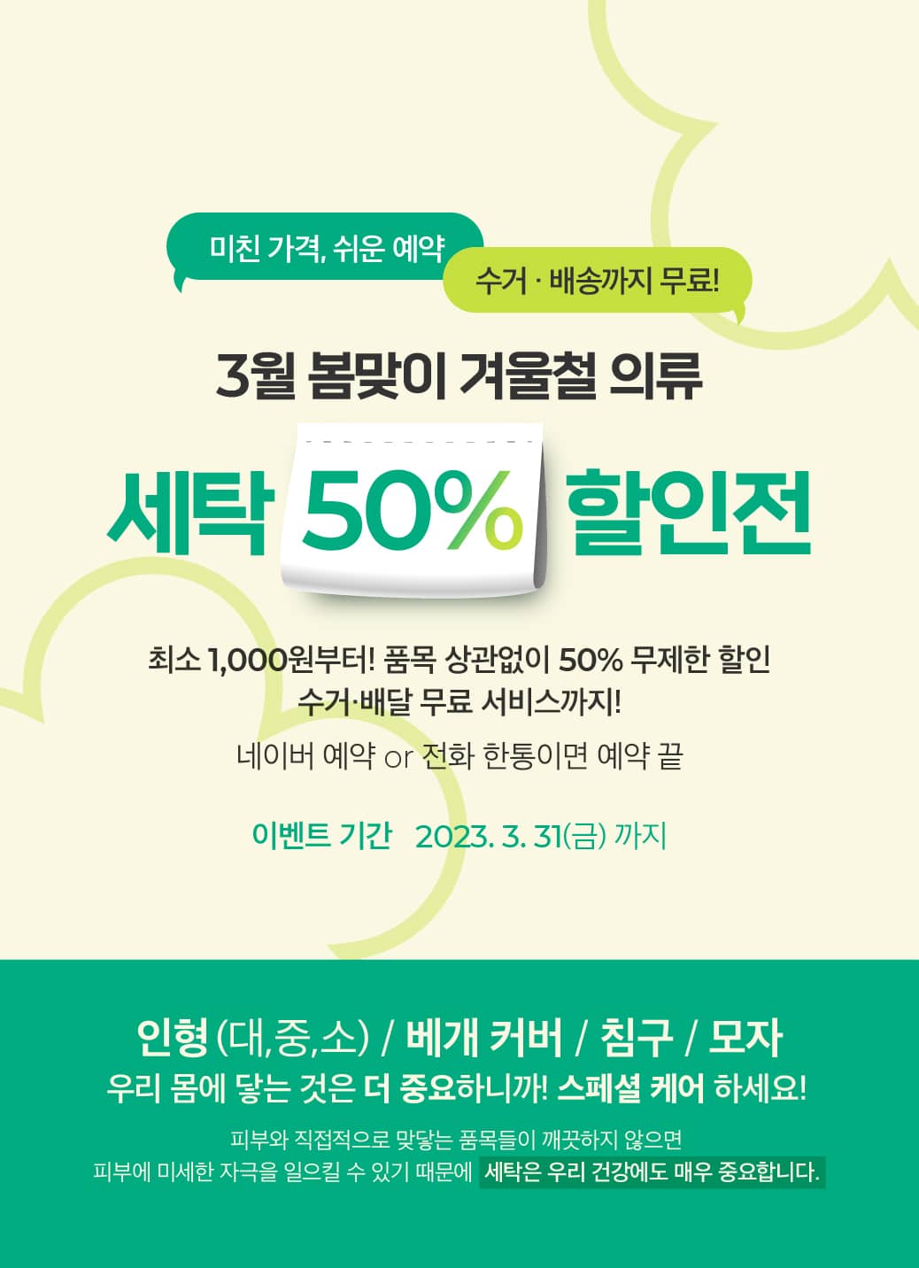 이번 ‘세탁 50% 할인전’은 경쟁 세탁서비스 업체들보다 합리적인 특별 가격에 와이셔츠는 1,000원, 니트는 2,400원에 이용이 가능하며 품목에 상관없이 50%를 할인해 주며 3만원 이상의 세탁 서비스를 예약할 경우 서울 강남과 송파와 함께 경기지역에 한해 수거와 배송을 무료로 제공하며 이번 할인전은 오는 31일까지 진행된다.