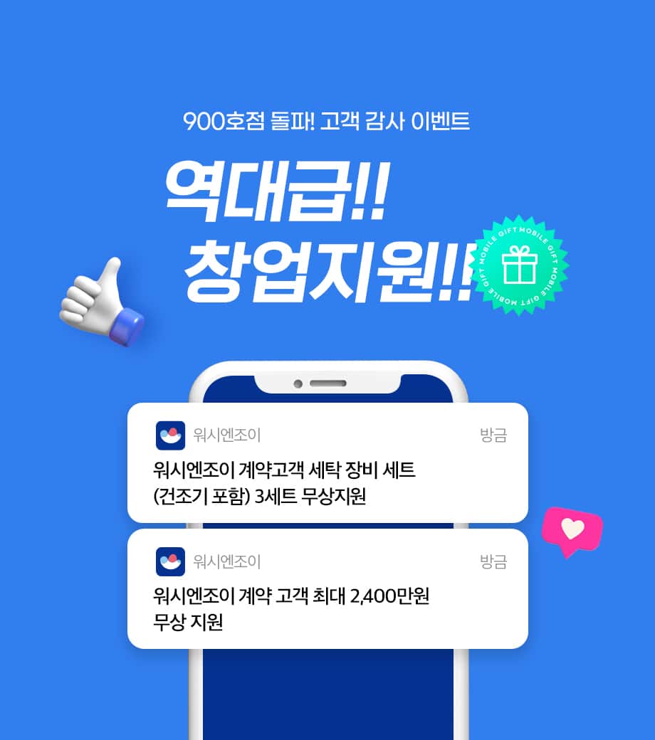 이와 함께 계약 고객들이 추가적으로 선택할 수 있는 혜택도 공개했다. ▲무인 커피머신 36개월 임대 시 중 6개월 임대료 지원 서비스 ▲운동화 세탁 장비 36개월 임대 시 3개월 임대료 지원 서비스 ▲100만원 상당의 세제 증정(워시엔조이 자사 쇼핑몰 라스365 포인트 추가 적립 서비스) ▲5년간 부품 무상 제공 서비스(단, A/S, 출장비, 공임비 별도) 총 4가지 중 2가지를 추가적으로 선택할 수 있다.