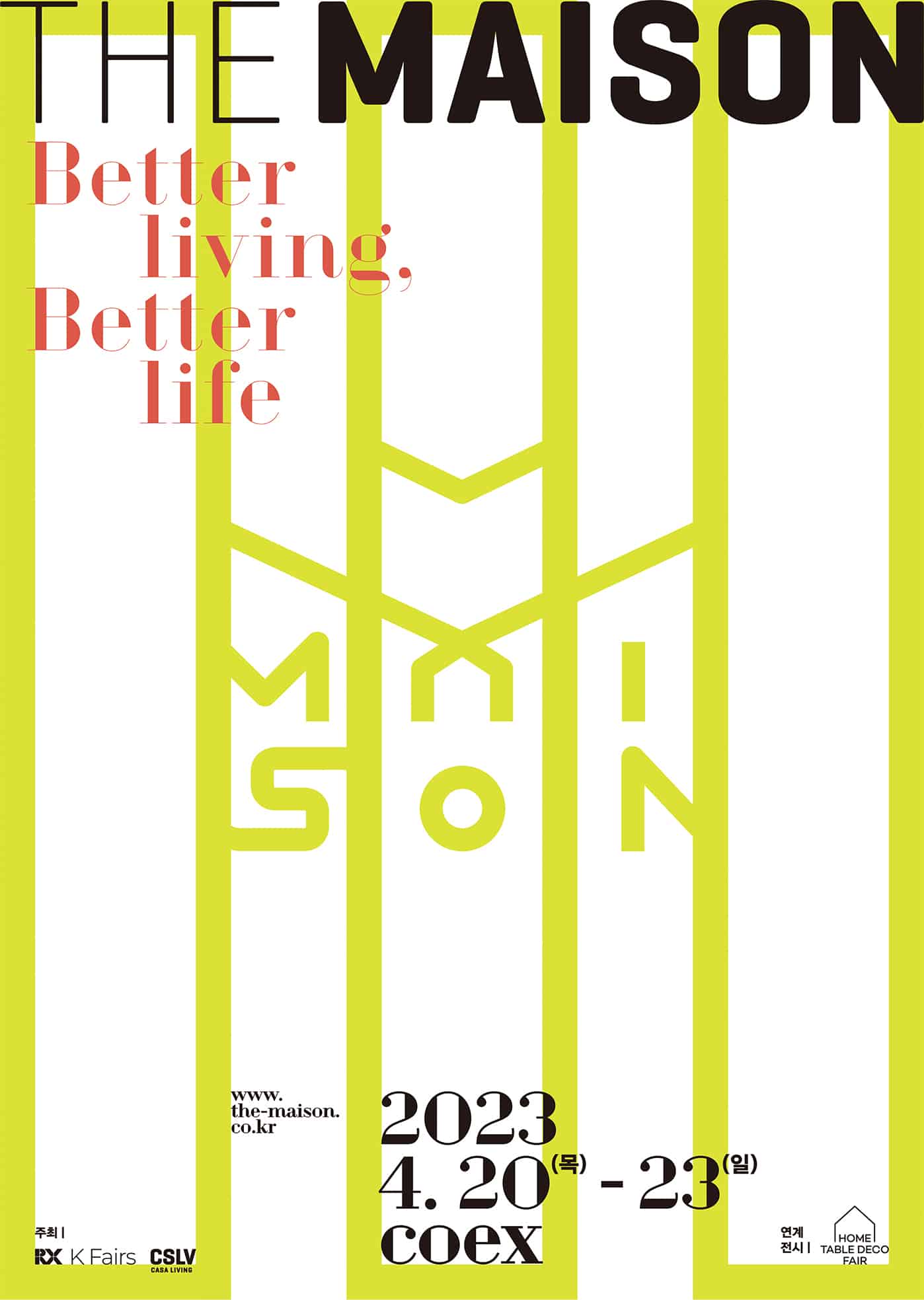 한편, 4월 20일부터 23까지 서울 삼성동 코엑스에서 개최되는 ‘더 메종’은 세계 3대 인테리어 전시로 꼽히는 프랑스 파리 메종오브제(Maison&Objet)를 주최하는 글로벌 전시 주최사 리드 익스비션스(Reed Exhibitions)와 국내 대표 전시 주최사 케이훼어스(K.Fairs)의 합작회사인 리드케이훼어스(Reed K.Fairs)가 주최한다.