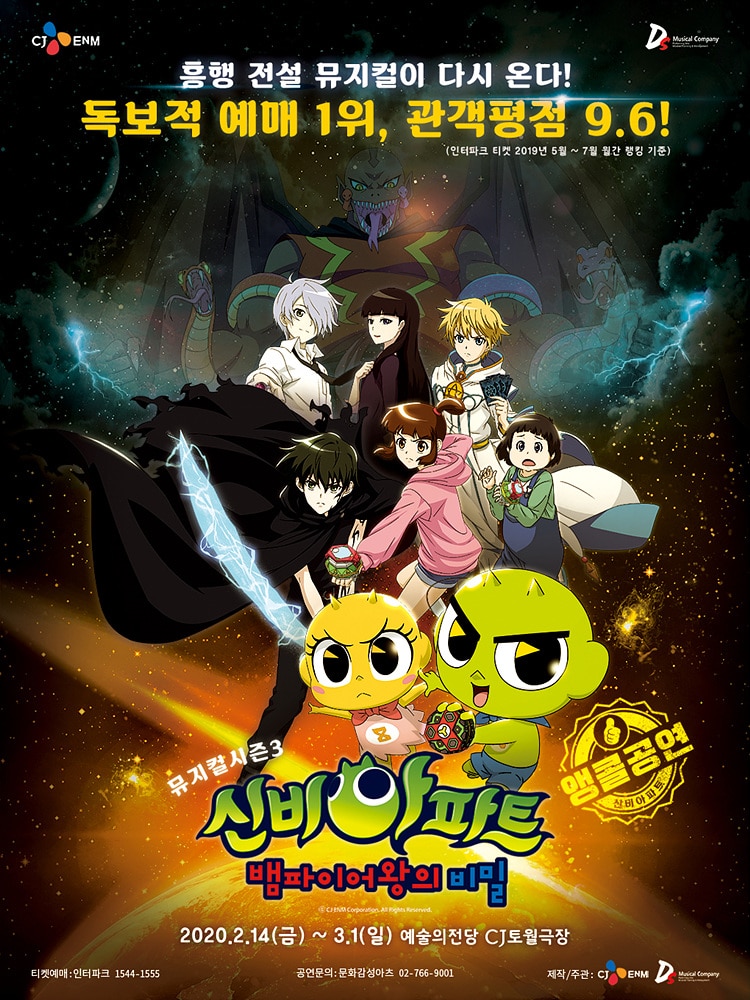 CJ ENM 애니메이션사업부는 이번 겨울방학 뮤지컬 최고 기대작인 <신비아파트 뮤지컬 시즌3: 뱀파이어왕의 비밀> 서울 앵콜 공연을 2월 14일부터 3월 1일까지 예술의전당 CJ토월극장에서 막을 올린다고 18일 밝혔다.