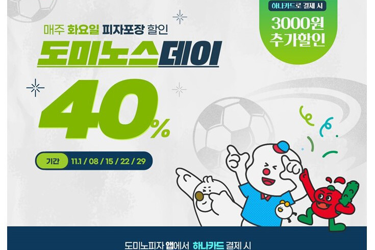 도미노피자, 포장 40% 할인에 하나카드 추가 할인까지!!