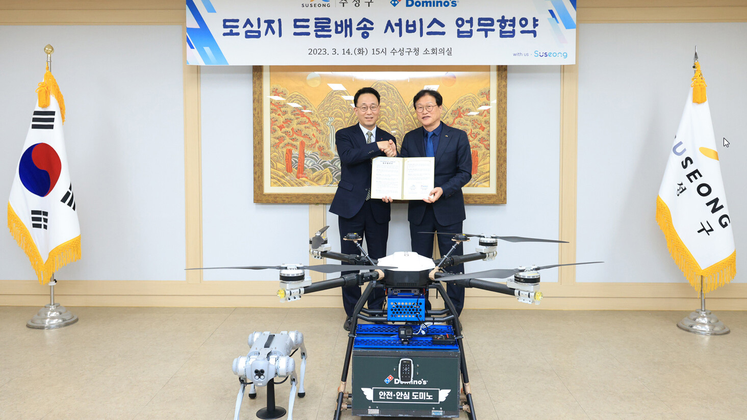 도미노피자, 대구 수성구와 도심지 드론 배달 서비스 MOU 체결